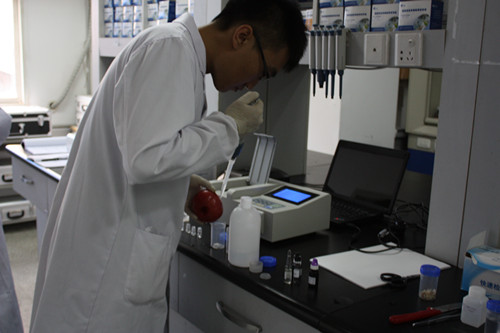 1、滴8ml農殘緩沖液在西紅柿表面于干凈容器中。