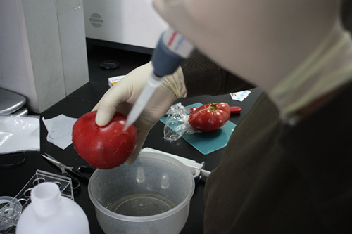 1、 滴 2-3 滴農殘洗脫液在西紅柿表面表面。