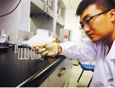 隨后,實驗人員把裝有樣品液的比色皿放到檢測儀器中檢測讀數(shù),數(shù)值顯示在電腦屏幕上。