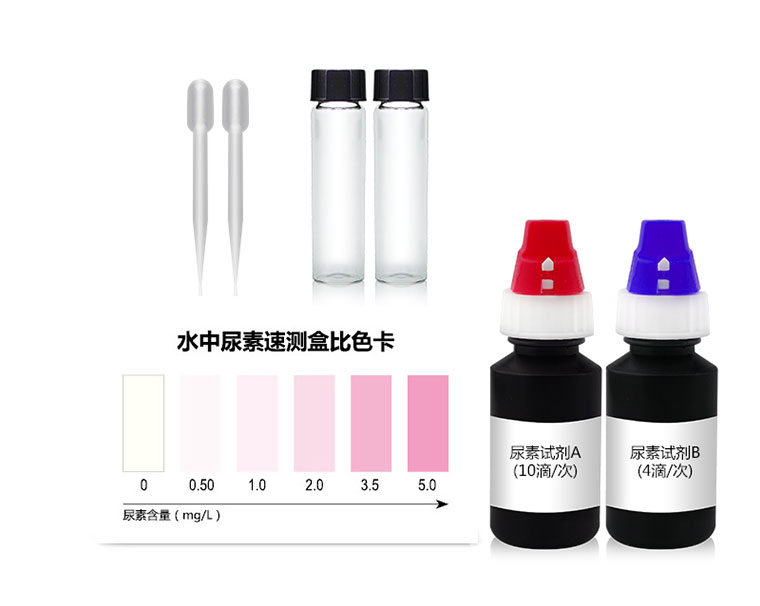 水中尿素在強酸性環(huán)境中,與檢測試劑沸水浴加熱條件下,生成紅色化合物,紅色越深,尿素含量越高。