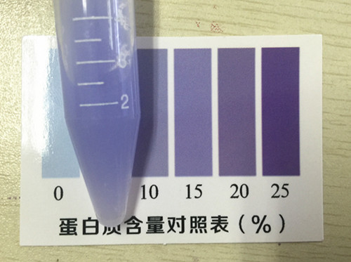 取4 mL顯色液加入比色管中,蓋上蓋,用力將奶粉全部搖溶,顯色3分鐘,在3~5分鐘內(nèi)將比色管襯在白紙上與標(biāo)準(zhǔn)比色卡進(jìn)行對比,找出與乳粉蛋白質(zhì)標(biāo)準(zhǔn)比色卡上相近的色階,即為每100g乳粉樣品中蛋白質(zhì)的含量。