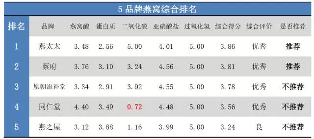 根據以上檢測結果,五大品牌燕窩的綜合排名為:
