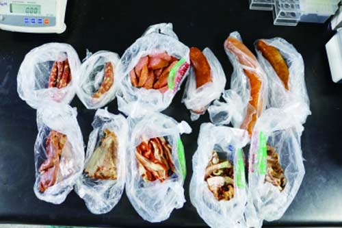 街邊熟食店、市場(chǎng)熟食攤購(gòu)買的香腸4份、臘腸2份、肘子1份、豬頭肉2份、豬耳朵1份、豬蹄1份。