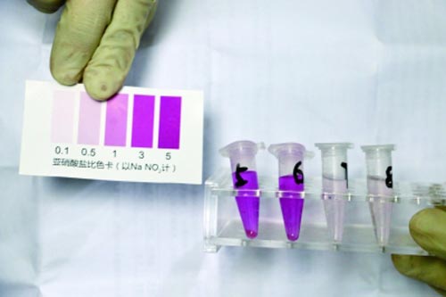 11個(gè)樣品檢測(cè)液顏色均有變化,均檢出亞硝酸鹽成分。其中5號(hào)、6號(hào)呈現(xiàn)紫紅色,亞硝酸鹽含量最高,45mg/kg,高于預(yù)包裝熟食不得超過30mg/kg的國(guó)家限量標(biāo)準(zhǔn)。