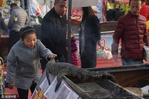 2017年1月31日,山東濱州,一燒烤攤主在春節廟會上銷售現烤現賣的鱷魚肉。廟會上,各類烤肉串、羊肉串已經不鮮見,但烤鱷魚肉不少趕廟會的人還是第一次見,許多市民爭相嘗鮮。為了吸引顧客,攤主擺了張著大嘴的整條鱷魚當招牌。