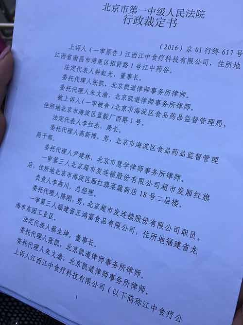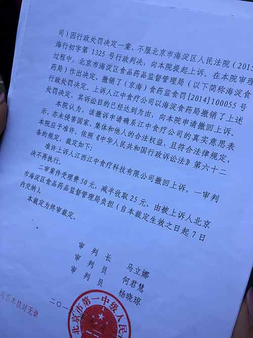 北京市第一中級人民法院的行政裁定書內容顯示,海淀區(qū)食藥監(jiān)局已撤銷對江中此前的行政處罰決定。 澎湃新聞記者 王文秋 圖