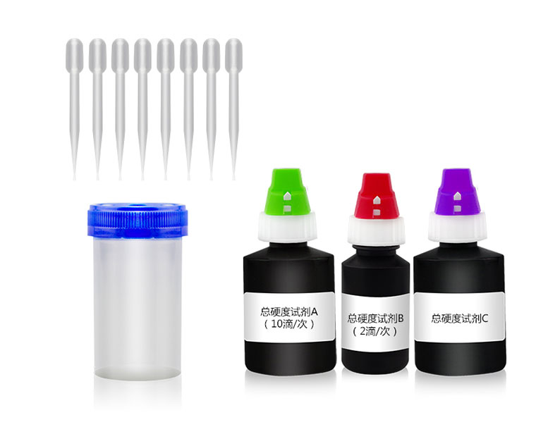 取5ml水樣于50mL塑料瓶中,加入10滴總硬度試劑A,加入2滴總硬度試劑B,搖勻,用總硬度試劑C直立式滴定,邊滴定邊搖動,滴至水樣由紫紅突變為藍色為止,記錄總硬度試劑C所消耗的滴數,同時用純凈水做一空白滴定,用樣品消耗總硬度試劑C滴數減去空白消耗滴數后乘以25即為水樣總硬度mg/L(以CaCO3計)。