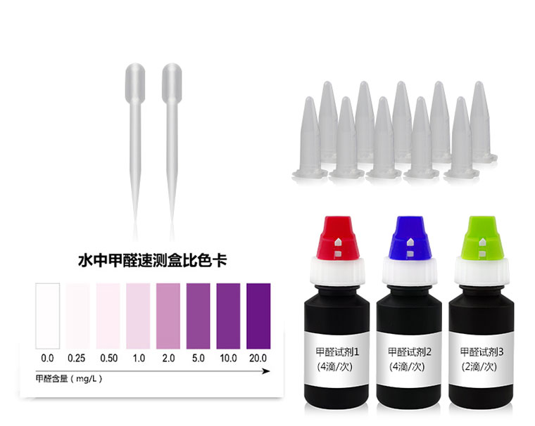 水中甲醛與檢測試劑反應生成紫紅色物質,含量越高顯色越深。