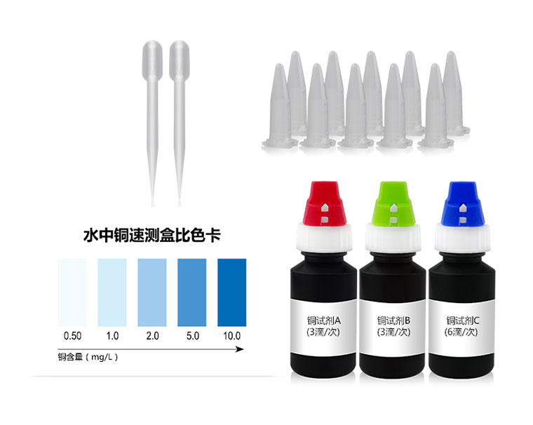 水中銅與檢測試劑反應(yīng)生成藍色化合物,含量越高藍色越深。