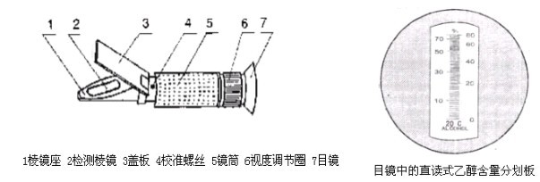 4.4 取酒樣 5~7 滴放在檢測棱鏡面上,徐徐合上蓋板,以下操作與 3.2 相同。視場明暗分界線處所示讀數(shù),即為乙醇含量%。重復操作幾次,使讀數(shù)穩(wěn)定。4.2 取酒樣 5~7 滴放在檢測儀棱鏡面上,緩緩合上蓋板。讀取視場明暗分界線處所示讀數(shù),即為乙醇百分含量。重復操作幾次,使讀數(shù)穩(wěn)定。