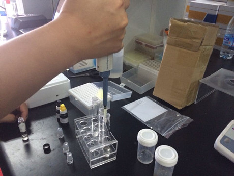 2、 取3根試管,1、2號試管作為樣品管,3號為對照管。在樣品管加入3ml樣品液,在對照管中加入3ml緩沖液,隨后分別加入20ul顯色劑和50ul酶試劑,蓋塞混勻靜置10min。加入20ul底物,混勻后迅速倒入比色皿,放入農(nóng)殘儀進行檢測。