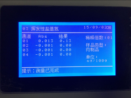放入儀器中,檢測。檢測結(jié)果顯示揮發(fā)性鹽基氮含量。鮮(凍)畜肉≤15mg/100g,樣品中揮發(fā)性鹽基氮含量合格,符合國家標(biāo)準(zhǔn)。