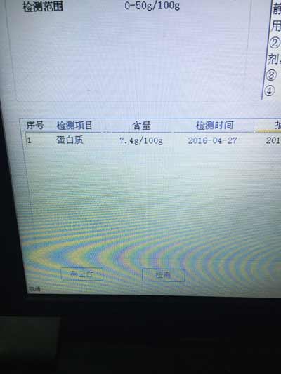 結果顯示,樣品中蛋白質含量為7.4g/100g,與產品包裝標示不符合。