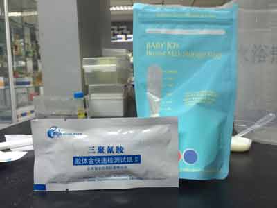在3~5分鐘內(nèi)讀取結(jié)果,其它時間判讀結(jié)果無效。結(jié)果顯示為陰性,即沒有三聚氰胺,符合國家標準。