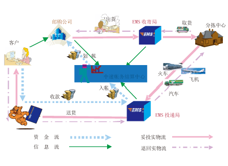 在代收貨款系統(tǒng)業(yè)務(wù)流程中,共有5個(gè)節(jié)點(diǎn),分別是:客戶、郵購公司、EMS收寄局、EMS投遞局和中速帳務(wù)結(jié)算中心,各節(jié)點(diǎn)之間的關(guān)系如下圖所示: